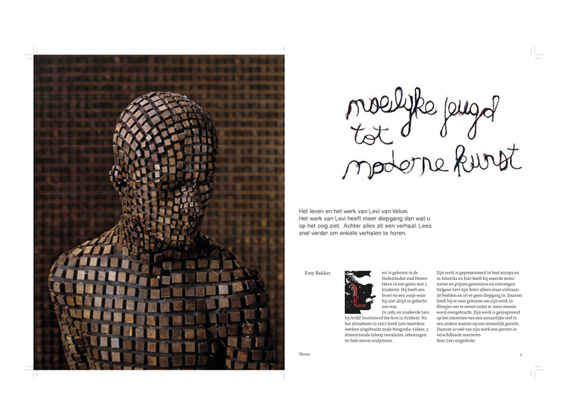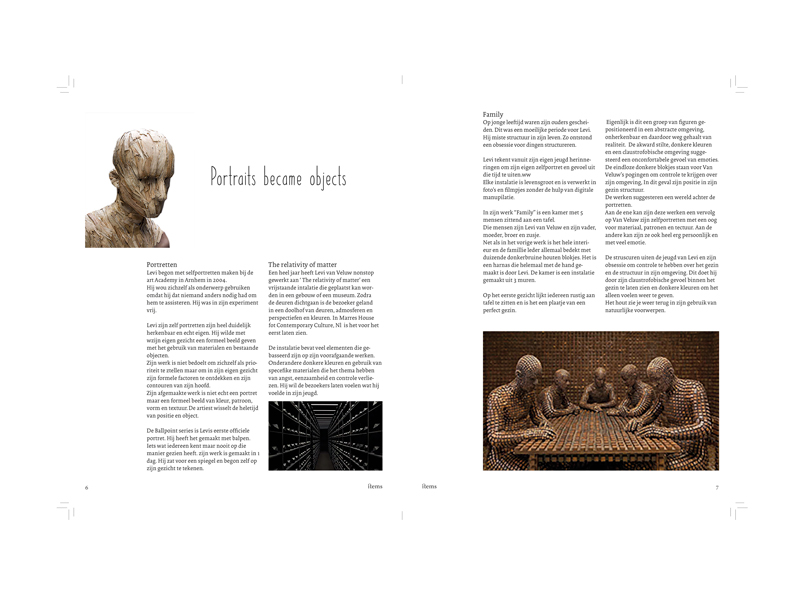 I designed two spreads about Levi van Veluw. He’s a dutch artist that makes mainly portrets and instalations. I made 2 spreads and a cover for a magazine called Items. The cover is inspired by his work. The heading from the spread is made with actual hair. This was also inspired by Levi’s work.